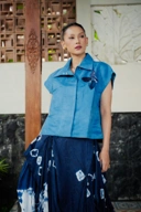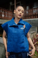 Keunikan vest ini terletak pada aplikasi motif artistik bernuansa biru di bagian dada, memberikan sentuhan etnik-kontemporer yang eksklusif dan membuat tampilan semakin standout. Warna cokelat hangat pada suede mudah dipadukan dengan berbagai outfit, baik untuk gaya kasual maupun semi-formal.